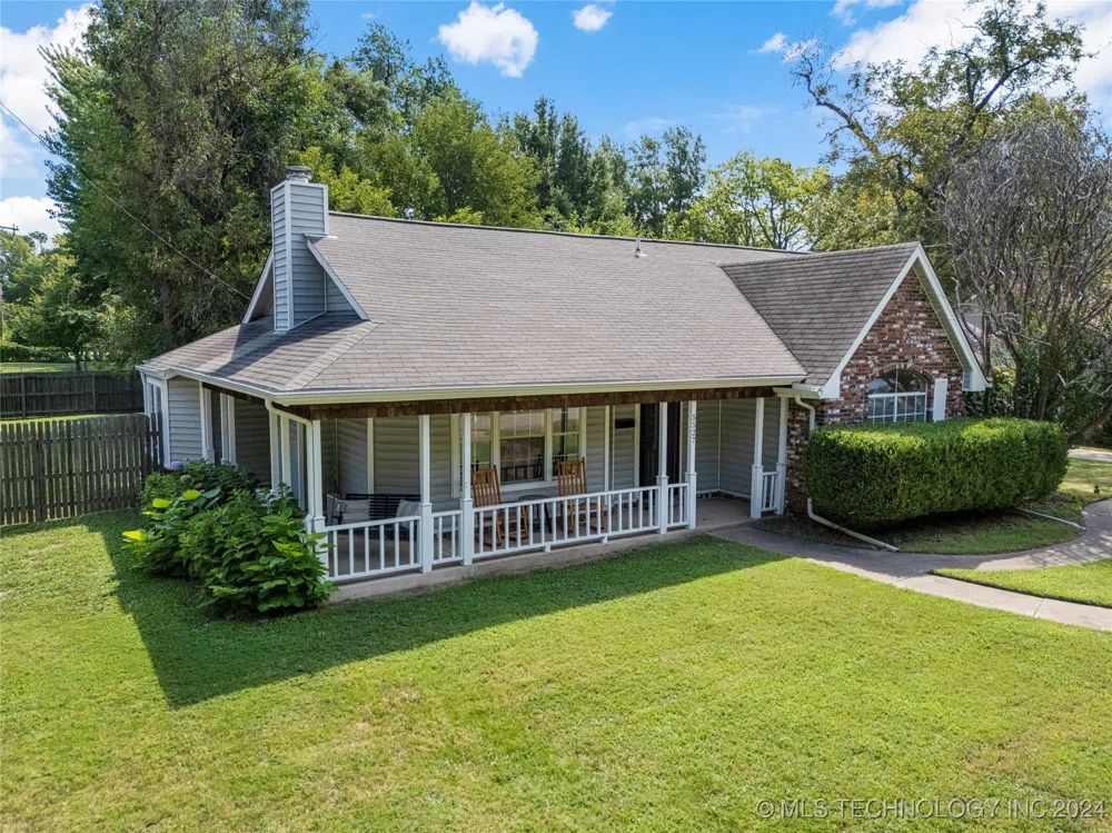 Charming home right across the street from a beautiful park! From your wraparound covered front porch, you can enjoy the view of the orchard. You can walk across the quiet and peaceful street to play pickleball, basketball, or just walk through the park. This spacious home with large lot features mature trees, a fully fenced backyard with privacy fence, 3 bedrooms with ample closet space, 2 full baths, and a side entry garage. Primary suite also has a large walk-in closet. Incredibly close and convenient to the River Parks, Brookside, highways, and Tulsa Hills.